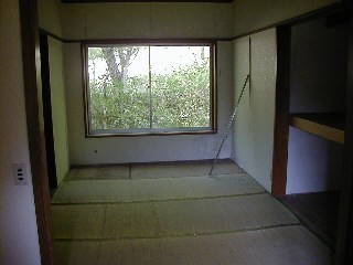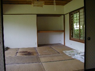 奥の部屋から上記の部屋を撮影。 雨漏りして居るみたいで、畳が腐食しています。 |